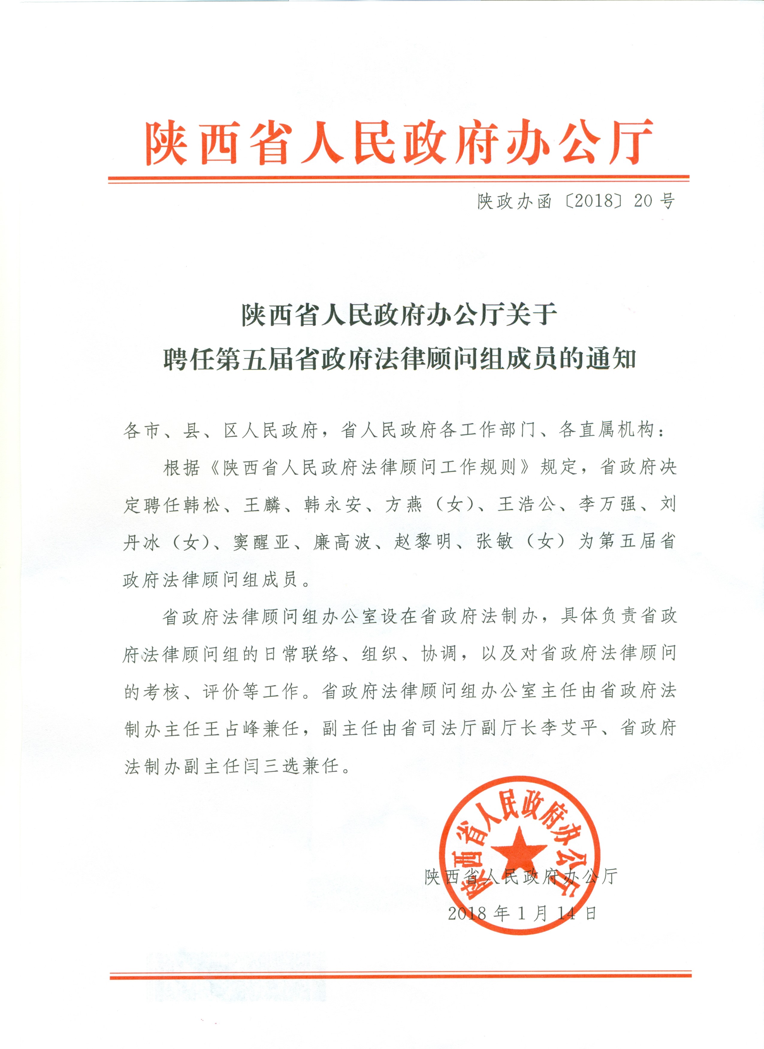 为完善和推行政府法律顾问制度,大力弘扬法治精神,及时反映人民群众诉求,推动法治政府建设迈上新的台阶。陕西省于3月22日举办第五届省政府法律顾问组聘任仪式,省长刘国中颁发聘书并讲话,常务副省长梁桂主持。我院刘丹冰教授与88级校友王浩公受聘为陕西省人民政府第五届法律顾问。