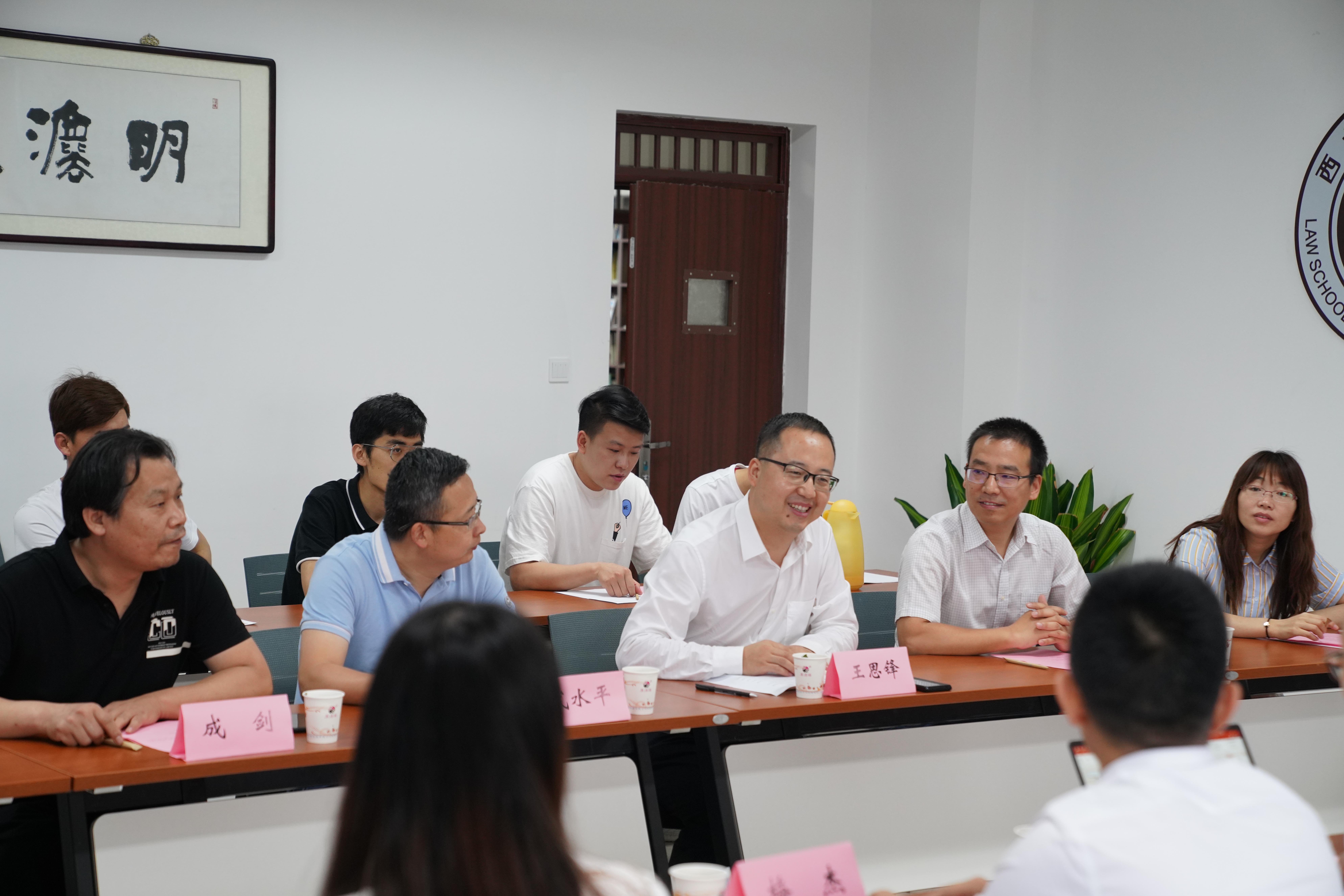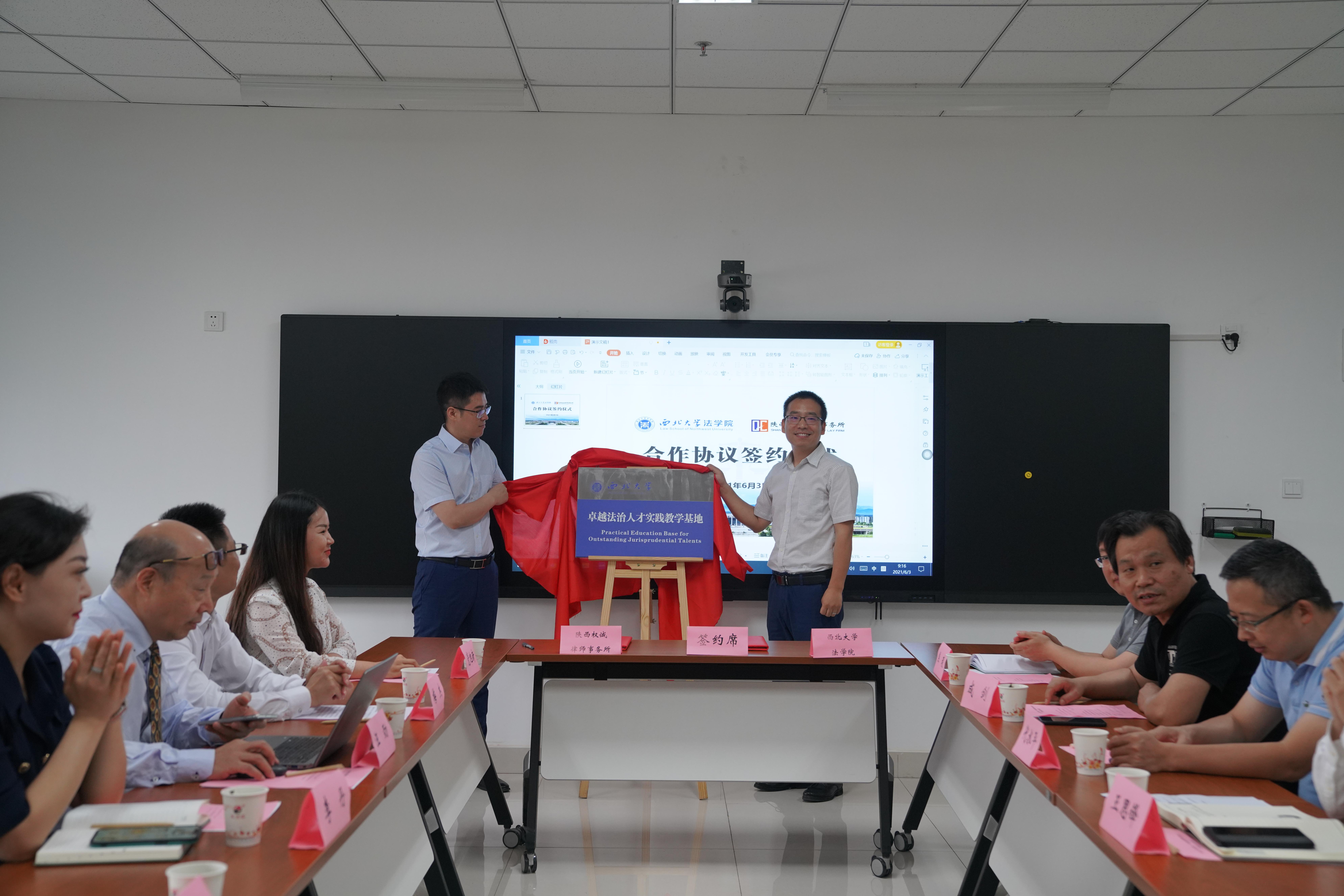 王思锋院长与李丹主任代表双方单位签署了合作协议。学院环境与资源保护法学教研部主任王社坤教授和陕西权诚律师事务所副主任张宝刚律师共同为实践教学基地揭牌。学院副院长代水平向陕西权诚律师事务所主任李丹、副主任张宝刚和高级合伙人梅杰颁发了法律硕士实务导师聘书。梅杰律师代表法律硕士实务导师作了发言,表示未来一定按照学院的要求,参与服务于学院研究生培养工作。