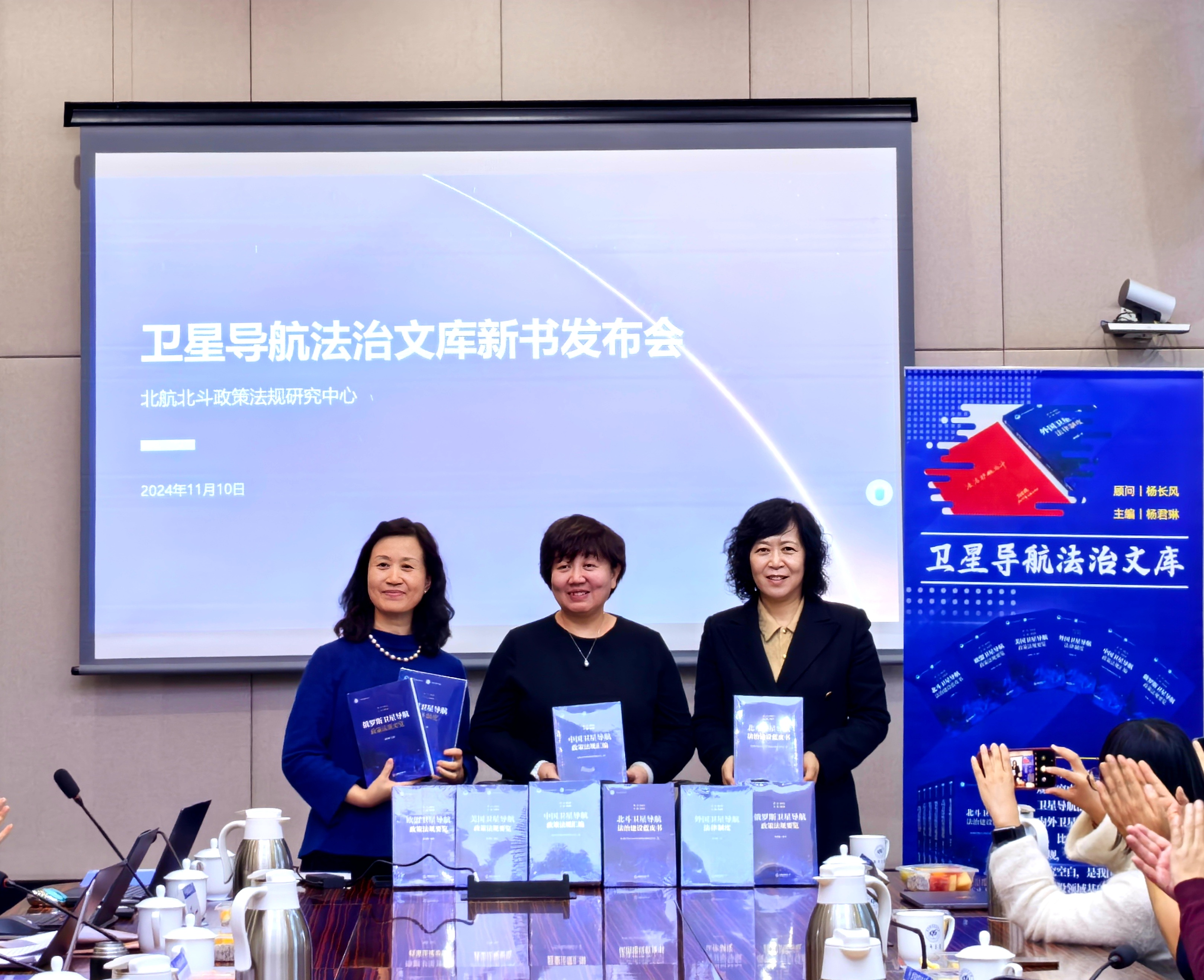 新书发布活动现场,杨君琳校友向大家分享了文库丛书的主要内容,以及文库丛书创作背后的故事她介绍到,该文库丛书主要聚焦国内外卫星导航领域法治建设经验成果,比较分析美俄欧卫星导航政策法规,填补卫星导航领域法律制度研究空白,是我国首套卫星导航法治建设领域基础性、系统性前沿性的丛书,为《中华人民共和国卫星导航条例》起草及审查工作提供理论支撑和域外借鉴。共和国勋章获得者、两弹一星功勋科学家、中国科学院院士孙家栋为文库题词中国工程院院士、北斗系统工程总设计师杨长风担任文库总编。