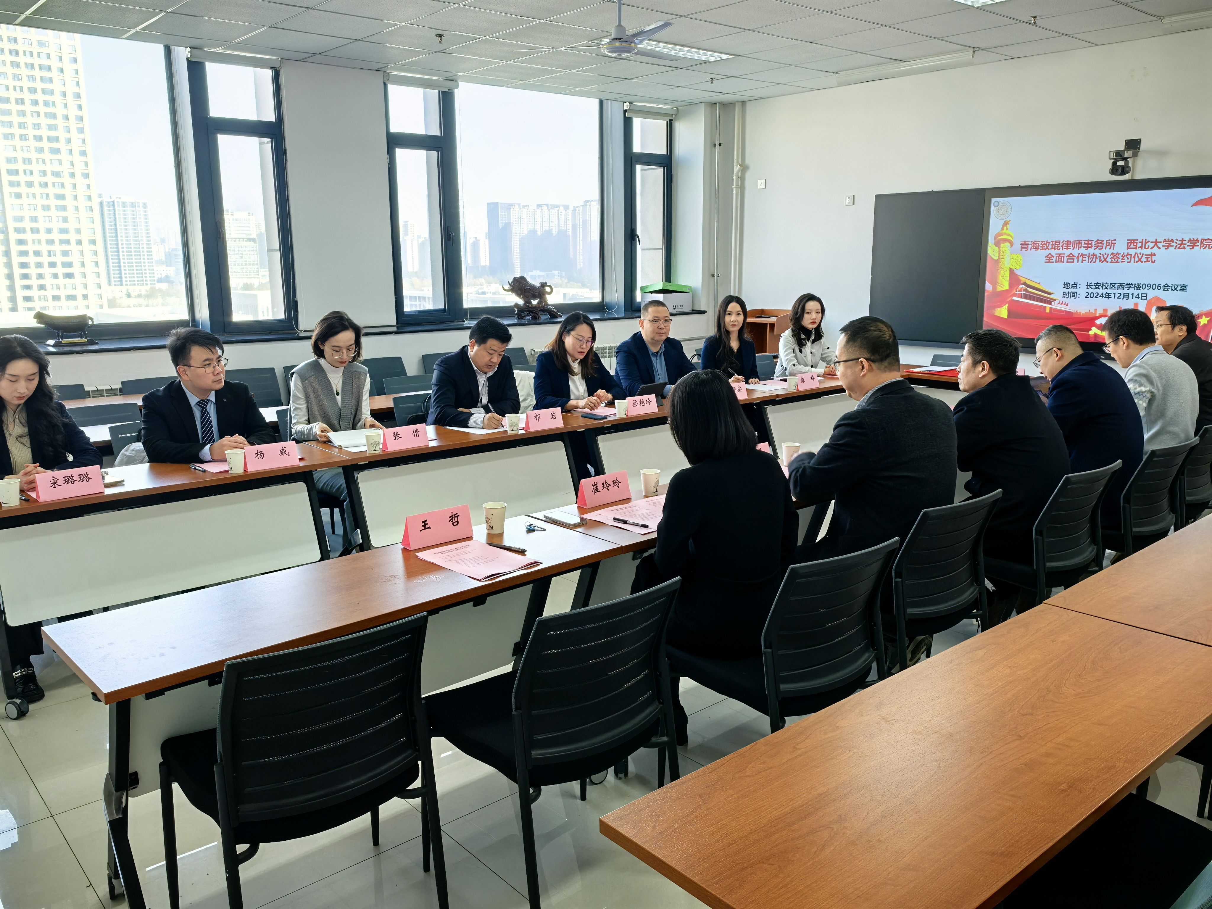 20241214上午我院与青海致琨律师事务所共建法律教学实践基地签约暨揭牌仪式在长安校区西学楼举行。青海致琨律师事务所主任祁岩,事务所高级合伙人、党支部书记梁艳玲,事务所高级合伙人张倩、禅静安,事务所合伙人、投资并购中心、并购重组法律服务部负责人杨威,事务所争议解决法律服务部负责人陈梅,事务所破产与清算法律服务中心负责人宋璐璐和律师宋紫薇我院党委书记李一凡,院长王思锋,副院长代水平、崔玲玲,242net必赢太阳能环境资源治理研究中心主任王社坤,学院办公室主任王哲,学院宪法学与行政法学教研部教师谢寄博参加签约暨揭牌仪式。